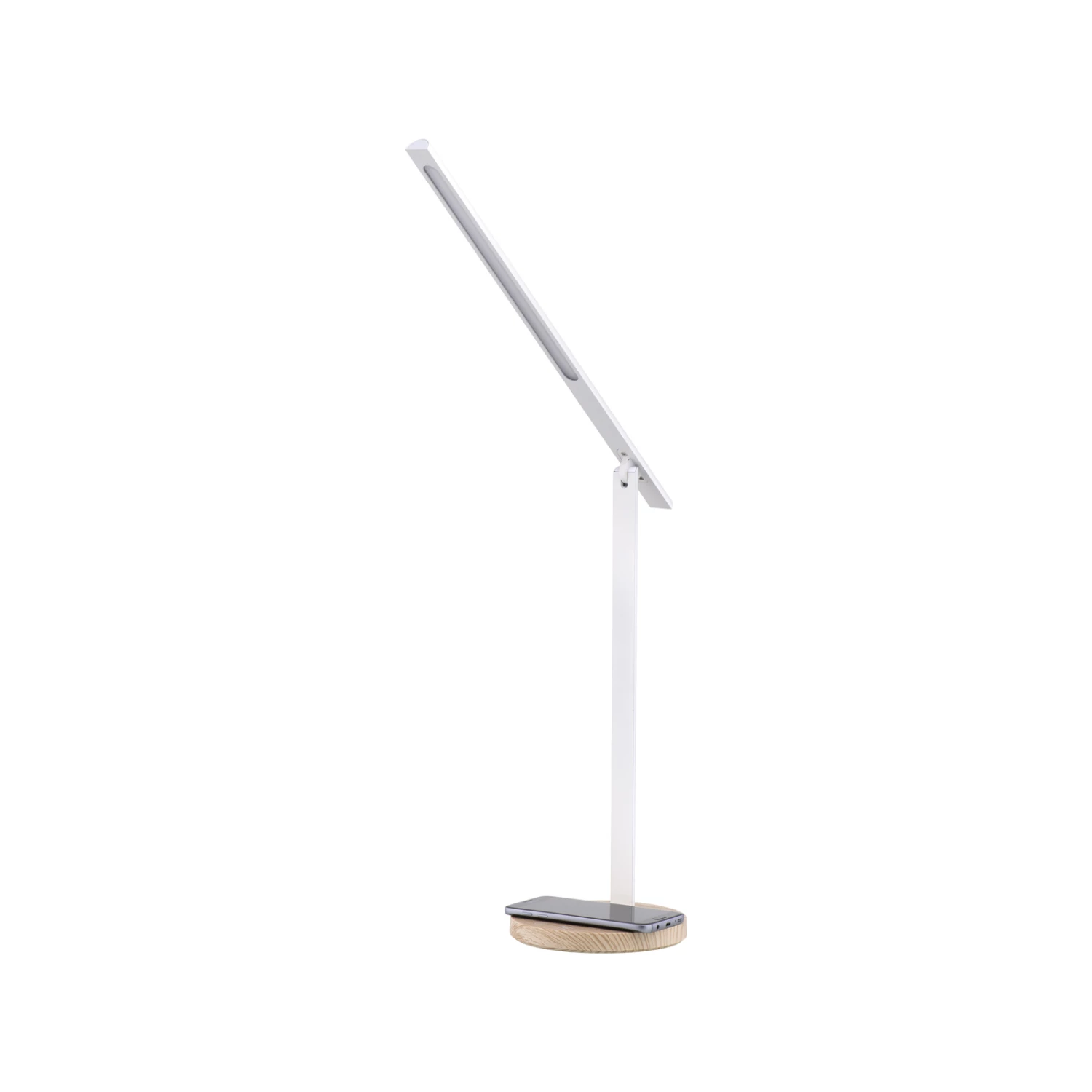 A multi-functional LED task lamp with a modern sleek shade and a wood-effect base. It provides various levels of light and three colour temperature choices. This, along with its fast wireless charging base and USB charging port, makes it perfect for any study room or workspace.