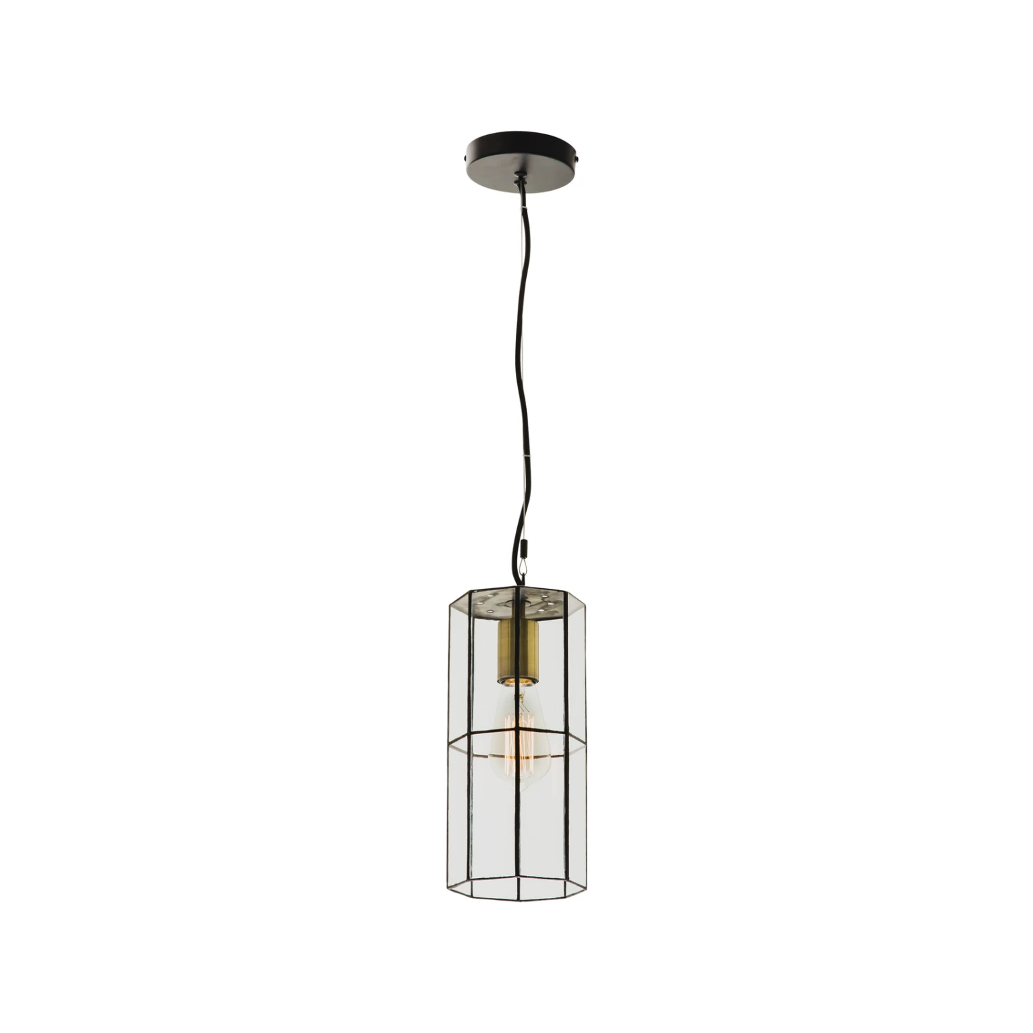 The Mayfair is a clear glass pendant framed by matt black metal in a traditional, antique style. The pendant is accented by a brass lampholder which enhances its antique expression.