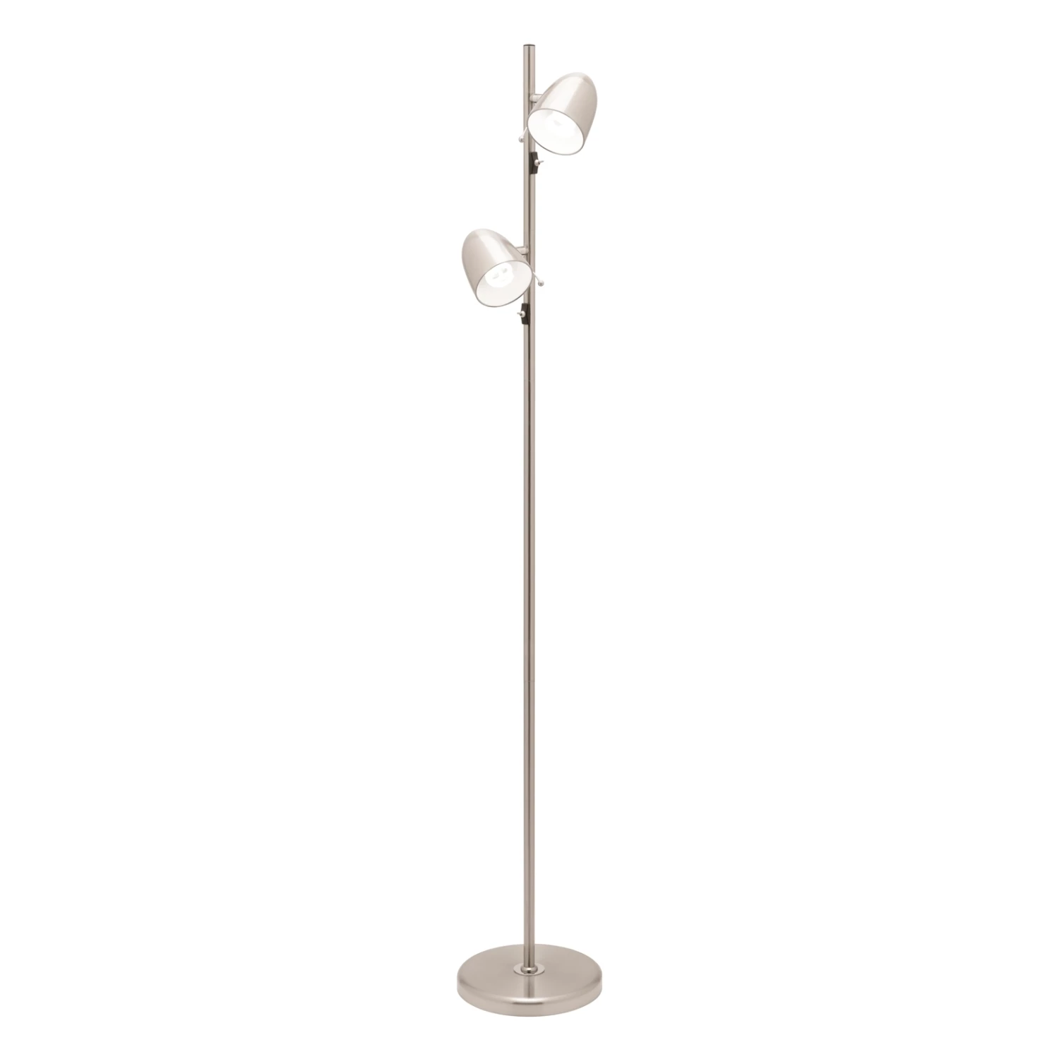 Brushed chrome two light floor lamp with versatile, functional design for use in any room.