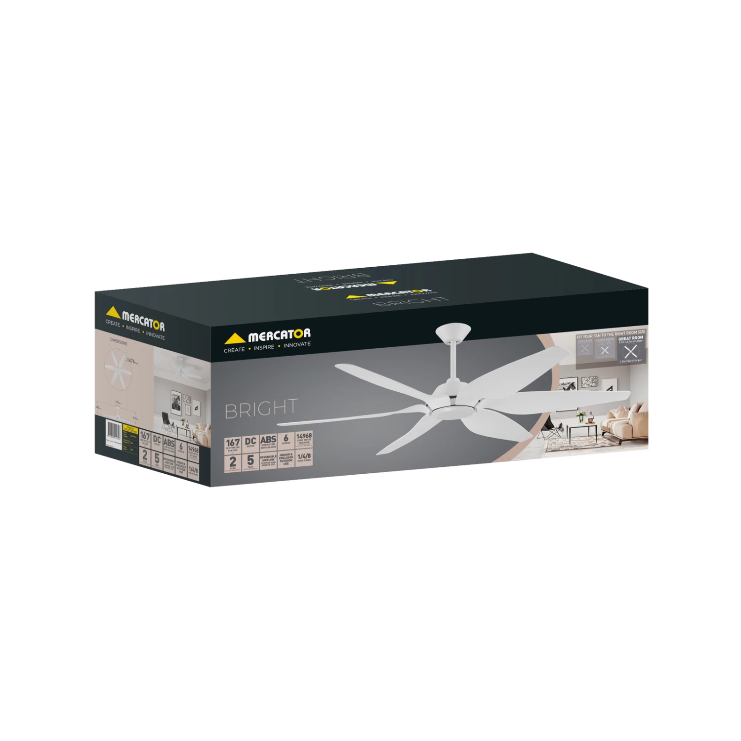 Mercator’s Bright ceiling fan features an ABS non-rusting body and 6 blades, offering a quick and easy fan installation that fits in any indoor setting with style and functionality. With a brilliant white finish, BRIGHT measures at 1676mm (66″), delivering high performance efficiently and effectively at multiple speed controls.
