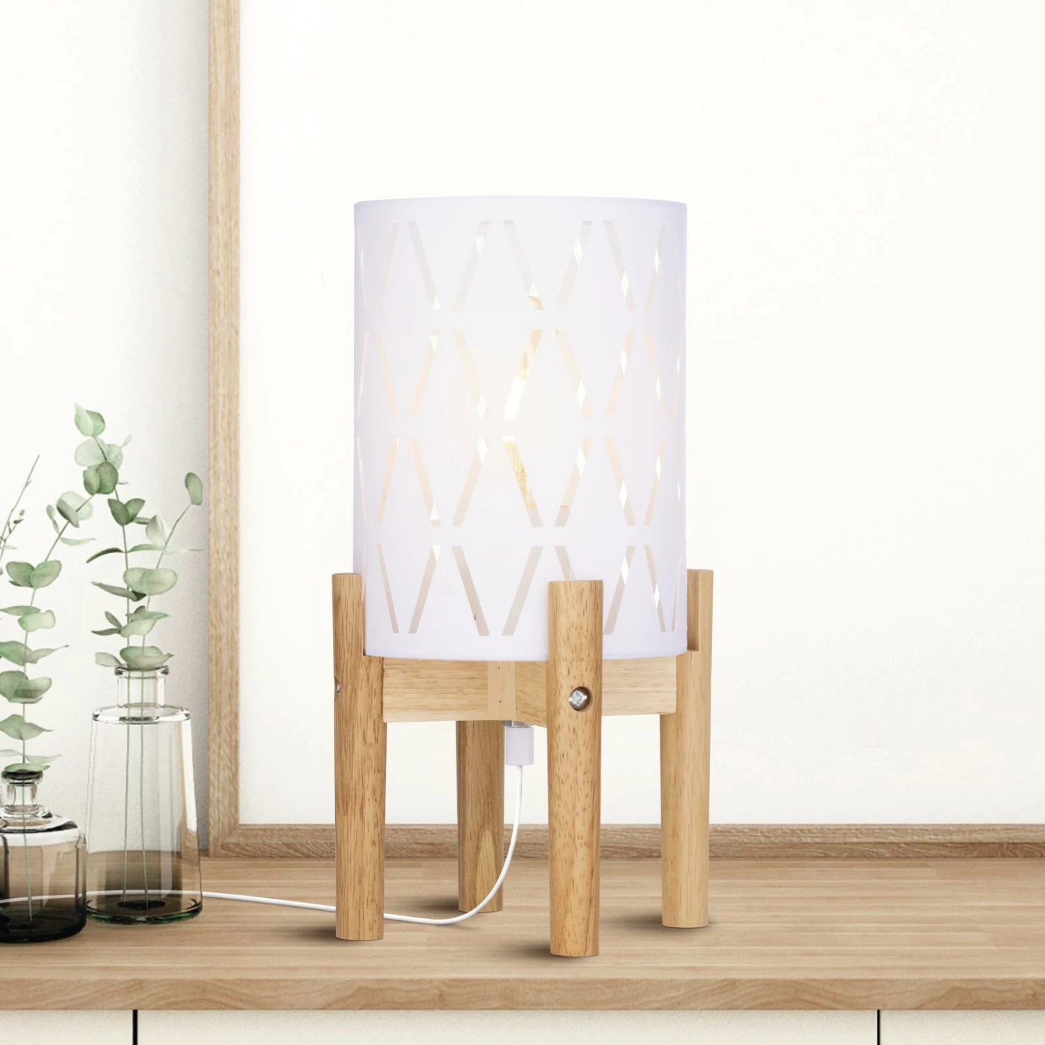 - Material: White Linen & Natural Wood