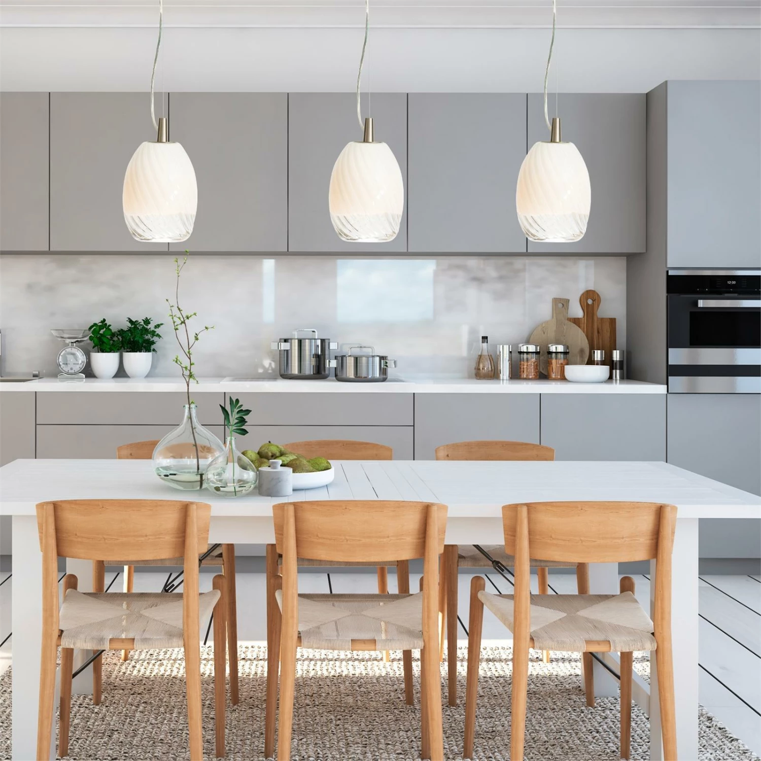 The Serena pendant has an unique swirl glass with a brushed Chrome canopy. Perfect for a contemporary retro twist.