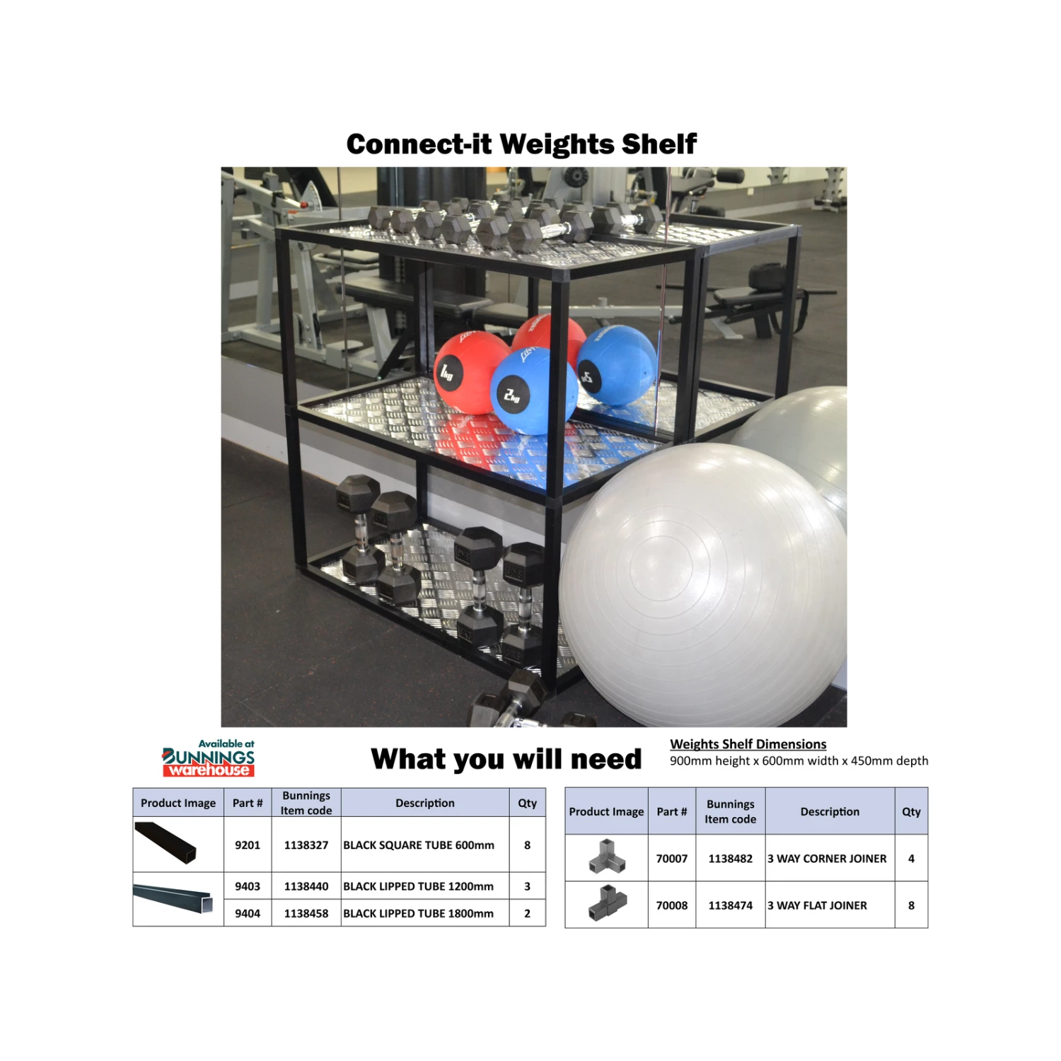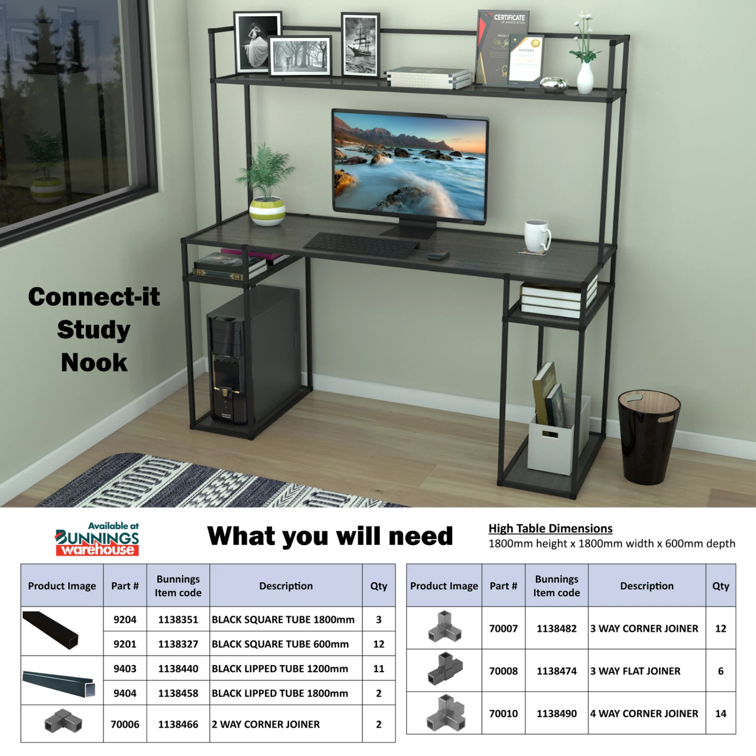 Metal Mate black anodised aluminium square tube is 25.4mm x 1.2mm thick and available in five convenient pre-cut lengths. The Connect-it system is easy to work with, simply tap the pieces together with the range of impact resistant corner joiners, creating right angled joins. Make coffee tables, storage racks, shelving units, trolleys, display fixtures, tables, benches and more.